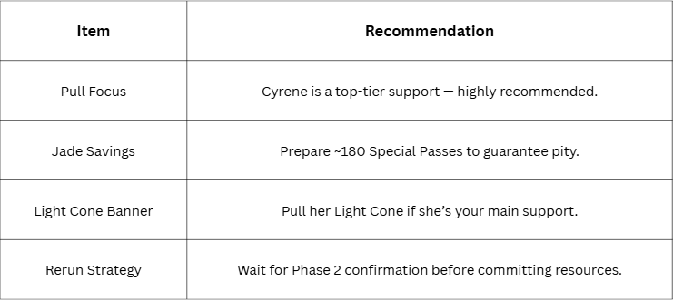 😀Based on your team comp and resources, prioritize pulling for Cyrene first. If you’re short on a solid main DPS, Sapphire or Clara are both strong picks to fill that gap.😀