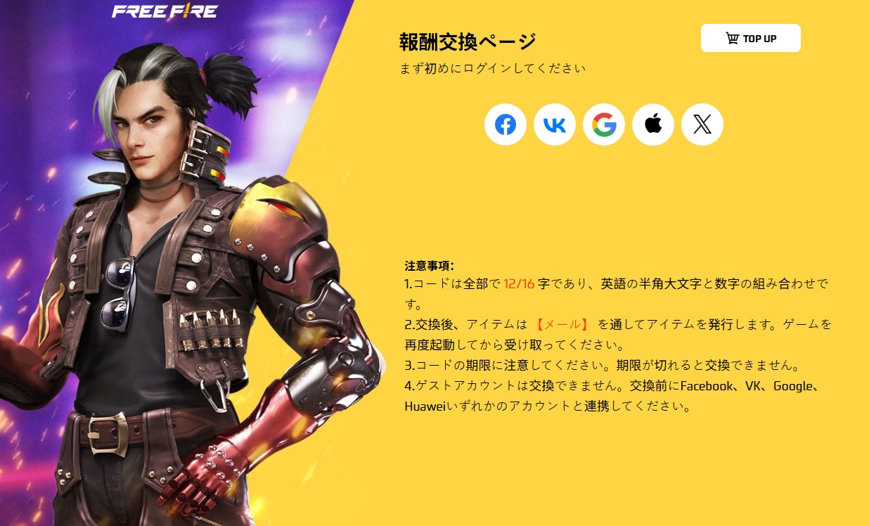 公式の交換ページにアクセス( https://reward.ff.garena.com/jp )