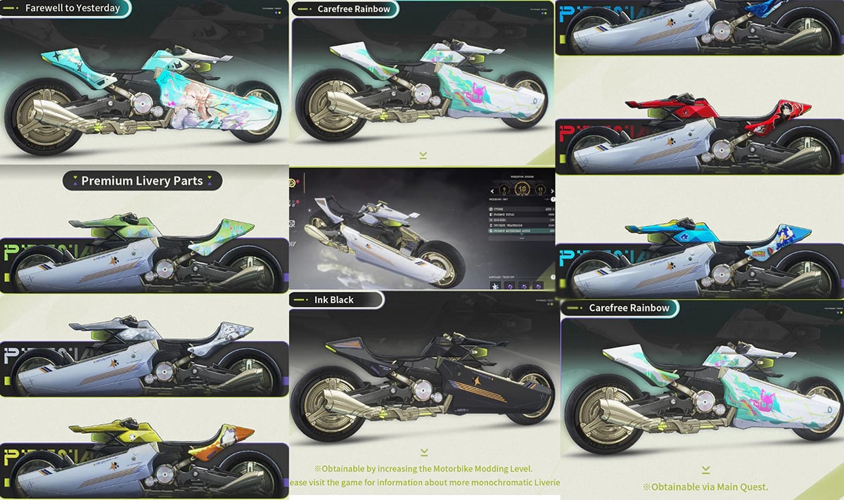 官方已公布共 10 套摩托塗裝皮膚。其中有 9 套 可透過遊戲內活動免費獲得,取得方式包含潮汐任務、提升摩托等級以及各類日常或活動任務,整體門檻相對親民。
